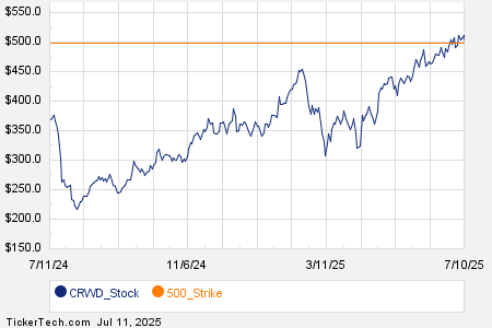 Looking at options trading activity among components of the S&P 500 index, there is noteworthy activity today in CrowdStrike Holdings Inc (Symbol: CRWD), where a total volume of 31,599 contracts has been traded thus far today, a contract volume which is representative of approximately 3.2 million underlying shares (given that every 1 contract represents 100 underlying shares). That number works out to 99.5% of CRWD’s average daily trading volume over the past month, of 3.2 million shares. Especially high volume was seen for the $500 strike call option expiring July 11, 2025, with 2,274 contracts trading so far today, representing approximately 227,400 underlying shares of CRWD. Below is a chart showing CRWD’s trailing twelve month trading history, with the $500 strike highlighted in orange:
