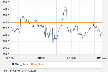 Looking at options trading activity among components of the Russell 3000 index, there is noteworthy activity today in The Gap Inc (Symbol: GAP), where a total volume of 133,054 contracts has been traded thus far today, a contract volume which is representative of approximately 13.3 million underlying shares (given that every 1 contract represents 100 underlying shares). That number works out to 155.8% of GAP’s average daily trading volume over the past month, of 8.5 million shares. Particularly high volume was seen for the $24 strike call option expiring December 19, 2025, with 77,083 contracts trading so far today, representing approximately 7.7 million underlying shares of GAP. Below is a chart showing GAP’s trailing twelve month trading history, with the $24 strike highlighted in orange: