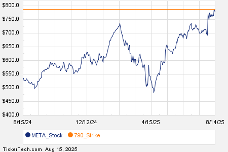 Looking at options trading activity among components of the Russell 3000 index, there is noteworthy activity today in Meta Platforms Inc (Symbol: META), where a total volume of 543,523 contracts has been traded thus far today, a contract volume which is representative of approximately 54.4 million underlying shares (given that every 1 contract represents 100 underlying shares). That number works out to 420.4% of META’s average daily trading volume over the past month, of 12.9 million shares. Especially high volume was seen for the $790 strike call option expiring August 15, 2025, with 54,900 contracts trading so far today, representing approximately 5.5 million underlying shares of META. Below is a chart showing META’s trailing twelve month trading history, with the $790 strike highlighted in orange: