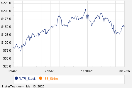 Among the underlying components of the Russell 3000 index, we saw noteworthy options trading volume today in Palantir Technologies Inc (Symbol: PLTR), where a total of 579,079 contracts have traded so far, representing approximately 57.9 million underlying shares. That amounts to about 105.9% of PLTR’s average daily trading volume over the past month of 54.7 million shares. Especially high volume was seen for the $155 strike call option expiring March 13, 2026, with 52,822 contracts trading so far today, representing approximately 5.3 million underlying shares of PLTR. Below is a chart showing PLTR’s trailing twelve month trading history, with the $155 strike highlighted in orange: