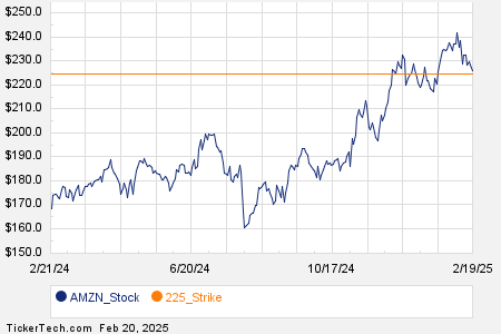 Looking at options trading activity among components of the S&P 500 index, there is noteworthy activity today in Amazon.com Inc (Symbol: AMZN), where a total volume of 362,418 contracts has been traded thus far today, a contract volume which is representative of approximately 36.2 million underlying shares (given that every 1 contract represents 100 underlying shares). That number works out to 97.4% of AMZN’s average daily trading volume over the past month, of 37.2 million shares. Particularly high volume was seen for the $225 strike call option expiring February 21, 2025, with 27,931 contracts trading so far today, representing approximately 2.8 million underlying shares of AMZN. Below is a chart showing AMZN’s trailing twelve month trading history, with the $225 strike highlighted in orange: