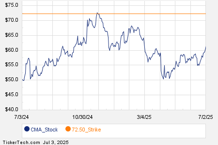 Looking at options trading activity among components of the Russell 3000 index, there is noteworthy activity today in Comerica, Inc. (Symbol: CMA), where a total volume of 14,369 contracts has been traded thus far today, a contract volume which is representative of approximately 1.4 million underlying shares (given that every 1 contract represents 100 underlying shares). That number works out to 104.4% of CMA’s average daily trading volume over the past month, of 1.4 million shares. Especially high volume was seen for the $72.50 strike call option expiring September 19, 2025, with 7,038 contracts trading so far today, representing approximately 703,800 underlying shares of CMA. Below is a chart showing CMA’s trailing twelve month trading history, with the $72.50 strike highlighted in orange: