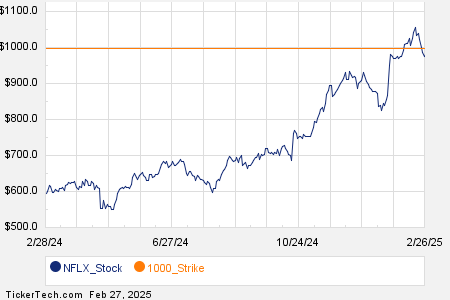 Among the underlying components of the Russell 3000 index, we saw noteworthy options trading volume today in Netflix Inc (Symbol: NFLX), where a total of 68,311 contracts have traded so far, representing approximately 6.8 million underlying shares. That amounts to about 186.2% of NFLX’s average daily trading volume over the past month of 3.7 million shares. Especially high volume was seen for the $1000 strike call option expiring February 28, 2025, with 5,831 contracts trading so far today, representing approximately 583,100 underlying shares of NFLX. Below is a chart showing NFLX’s trailing twelve month trading history, with the $1000 strike highlighted in orange: