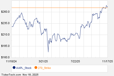 Among the underlying components of the S&P 500 index, we saw noteworthy options trading volume today in Apple Inc (Symbol: AAPL), where a total of 396,023 contracts have traded so far, representing approximately 39.6 million underlying shares. That amounts to about 81.1% of AAPL’s average daily trading volume over the past month of 48.8 million shares. Particularly high volume was seen for the $270 strike call option expiring November 21, 2025, with 30,156 contracts trading so far today, representing approximately 3.0 million underlying shares of AAPL. Below is a chart showing AAPL’s trailing twelve month trading history, with the $270 strike highlighted in orange: