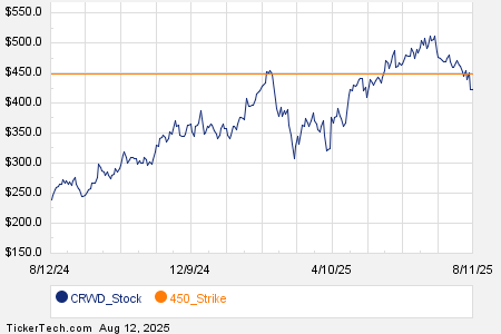 Among the underlying components of the S&P 500 index, we saw noteworthy options trading volume today in CrowdStrike Holdings Inc (Symbol: CRWD), where a total of 19,093 contracts have traded so far, representing approximately 1.9 million underlying shares. That amounts to about 71% of CRWD’s average daily trading volume over the past month of 2.7 million shares. Especially high volume was seen for the $450 strike call option expiring August 15, 2025, with 1,094 contracts trading so far today, representing approximately 109,400 underlying shares of CRWD. Below is a chart showing CRWD’s trailing twelve month trading history, with the $450 strike highlighted in orange: