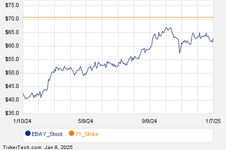 Looking at options trading activity among components of the S&P 500 index, there is noteworthy activity today in eBay Inc. (Symbol: EBAY), where a total volume of 71,830 contracts has been traded thus far today, a contract volume which is representative of approximately 7.2 million underlying shares (given that every 1 contract represents 100 underlying shares). That number works out to 162.1% of EBAY’s average daily trading volume over the past month, of 4.4 million shares. Especially high volume was seen for the $71 strike call option expiring January 10, 2025, with 6,715 contracts trading so far today, representing approximately 671,500 underlying shares of EBAY. Below is a chart showing EBAY’s trailing twelve month trading history, with the $71 strike highlighted in orange: