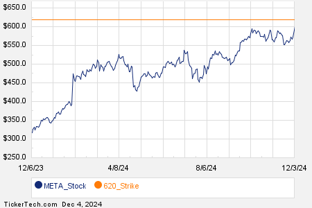 Looking at options trading activity among components of the Russell 3000 index, there is noteworthy activity today in Meta Platforms Inc (Symbol: META), where a total volume of 407,244 contracts has been traded thus far today, a contract volume which is representative of approximately 40.7 million underlying shares (given that every 1 contract represents 100 underlying shares). That number works out to 342.5% of META’s average daily trading volume over the past month, of 11.9 million shares. Especially high volume was seen for the $620 strike call option expiring December 06, 2024, with 31,434 contracts trading so far today, representing approximately 3.1 million underlying shares of META. Below is a chart showing META’s trailing twelve month trading history, with the $620 strike highlighted in orange:
