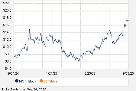 Looking at options trading activity among components of the Russell 3000 index, there is noteworthy activity today in Riot Platforms Inc (Symbol: RIOT), where a total volume of 372,891 contracts has been traded thus far today, a contract volume which is representative of approximately 37.3 million underlying shares (given that every 1 contract represents 100 underlying shares). That number works out to 89.7% of RIOT’s average daily trading volume over the past month, of 41.6 million shares. Especially high volume was seen for the $20 strike call option expiring September 26, 2025, with 44,135 contracts trading so far today, representing approximately 4.4 million underlying shares of RIOT. Below is a chart showing RIOT’s trailing twelve month trading history, with the $20 strike highlighted in orange: