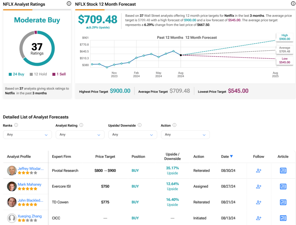 Wall Street’s verdict on NFLX stock leans towards a Moderate Buy, with 24 Buy ratings, 12 Holds, and a lone Sell in the past quarter. Despite a remarkable 50.25% surge in share value over the last year, the average price target of $709.48 presents a modest 6.29% upside potential, hinting at a tempered growth trajectory in the near future.