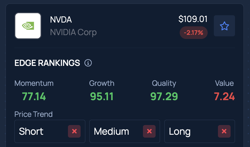 Benzinga’s Edge Rankings highlight strong momentum and growth rankings for Nvidia in the 77th and 95th percentiles, respectively. Curious how other stocks stack up? Click here to uncover growth and momentum scores for top stocks.