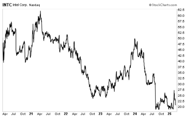 This was once an iconic American company. But take one look at Intel’s chart below. The chipmaker’s stock is down about 63% over the past five years.