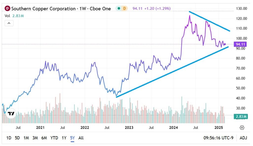 First, it’s possible that SCCO stock is currently charting a pattern reminiscent of a bullish pennant formation. Market technicians will almost certainly argue that the current pattern doesn’t meet the criteria of a “classic” pennant. Admittedly, it’s not the strongest argument for optimism in Southern Copper. That said, it’s intriguing that a formation resembling a pennant has materialized amid a key fundamental development.