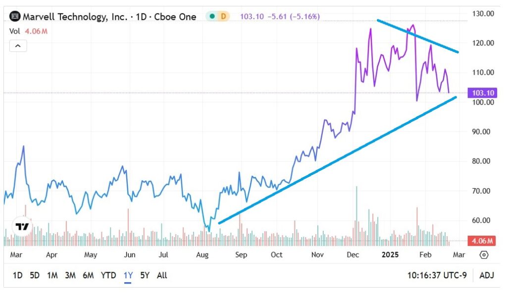 Nevertheless, it appears that the market is consolidating recent gains. Over the past half-year period, MRVL stock has gained about 46%. This enthusiasm appears to have waned among market whales, with MRVL encountering bearish activity recently in the options market. Notably, several institutional investors appear to be selling March 14 $105 call options.