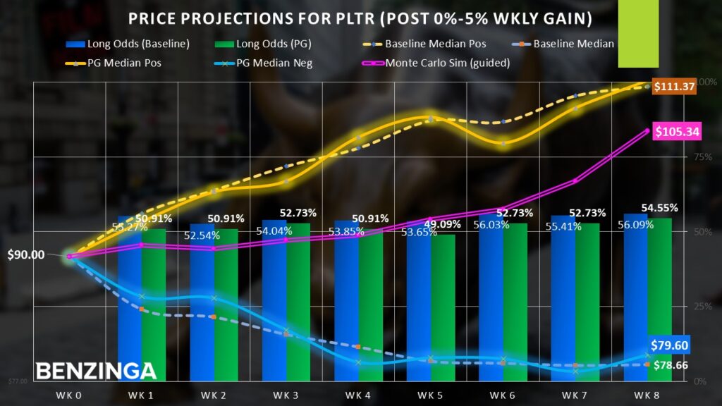 Statistically, PLTR stock demonstrates an upward bias. A position entered at the beginning of the week has a 55.3% chance of rising by the end of the week. The prior week’s modest momentum doesn’t appear to materially impact the aforementioned upward bias. Thus, it’s reasonable speculation to go long here.