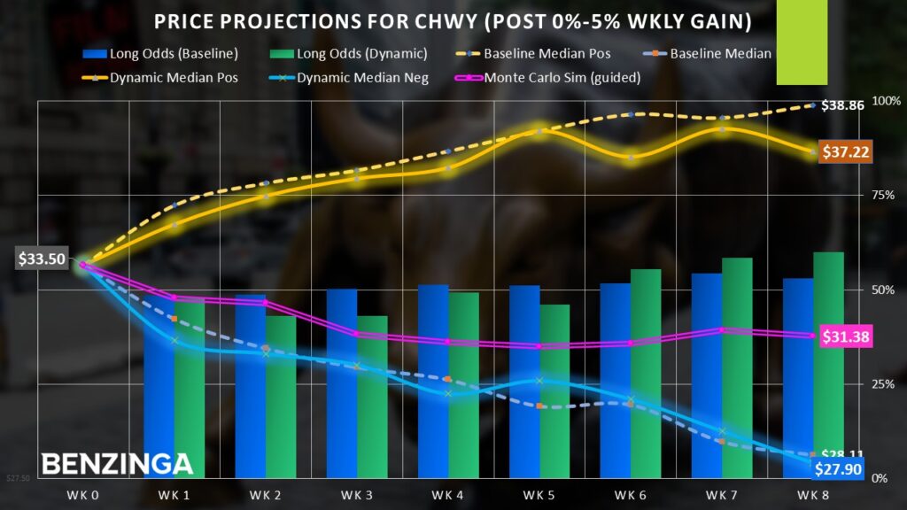 A major risk factor to consider, though, is the statistical framework. Since Chewy’s initial public offering, a long position held for any given eight-week period has a 53% chance of being profitable. Under the dynamic condition of modest momentum, this probability rises to 60%. However, in the earlier weeks, the probability favors the bears.