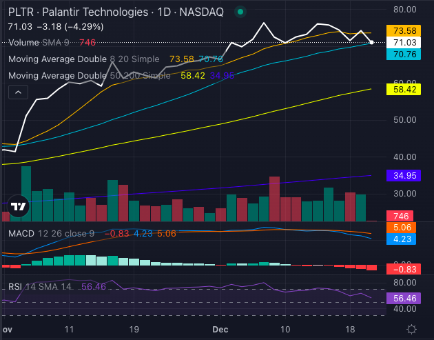 • Eight-day SMA: $73.58 (PLTR at $71.03 – selling pressure signals)
