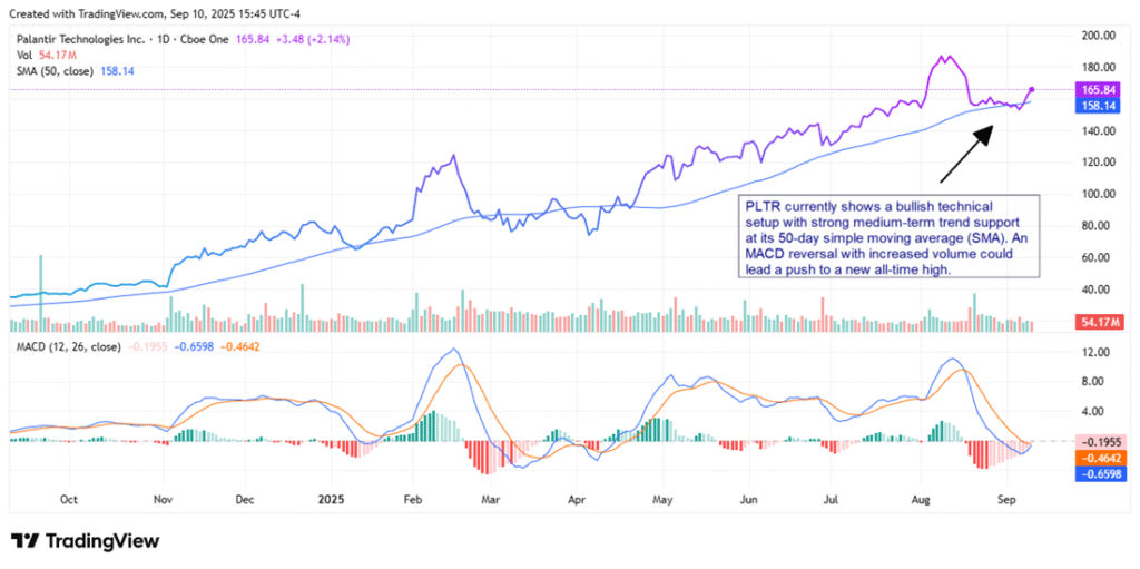 PLTR currently shows a bullish technical setup with strong medium-term trend support at its 50-day simple moving average (SMA). The stock is also showing improving MACD momentum, and a neutral RSI (not shown) that suggests there is still room for the stock to move higher.