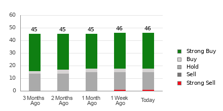 Netflix currently has an average brokerage recommendation (ABR) of 1.75, on a scale of 1 to 5 (Strong Buy to Strong Sell), calculated based on the actual recommendations (Buy, Hold, Sell, etc.) made by 46 brokerage firms. An ABR of 1.75 approximates between Strong Buy and Buy.