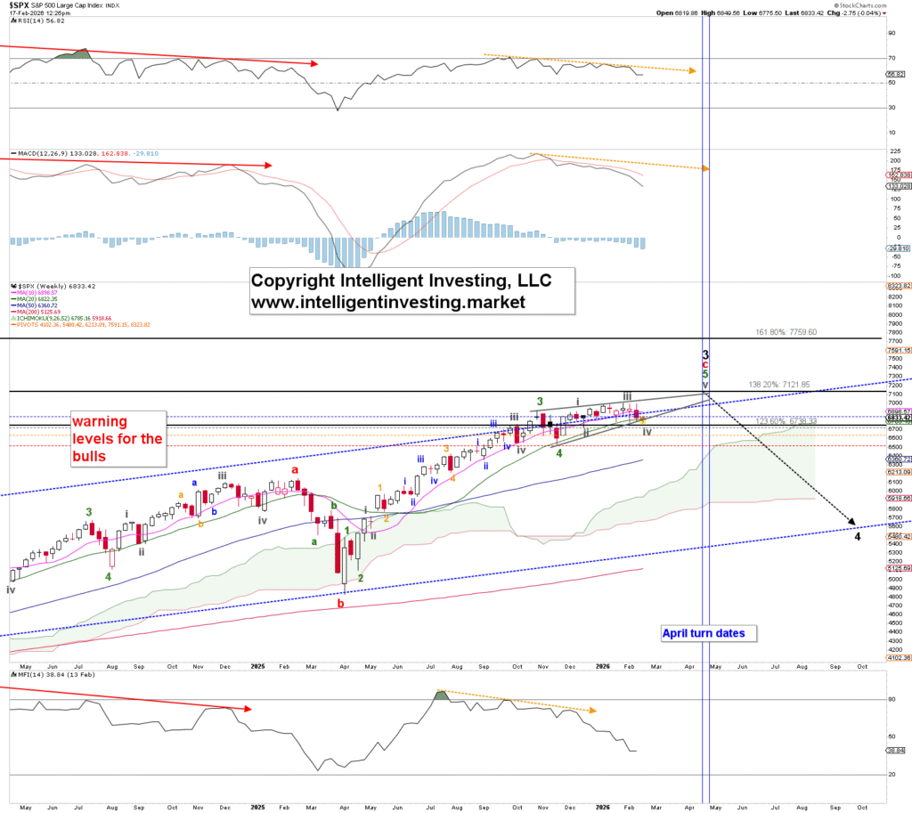 Thus, if the Bulls can at least hold 6780, our third warning level, which equates to a 60% chance that the uptrend is over on a daily close below it, we can allow for that last gray W-v to ideally 7120-7190 to take hold into the April turn date window (see also here). If the can’t we have to watch for the 6575 level.