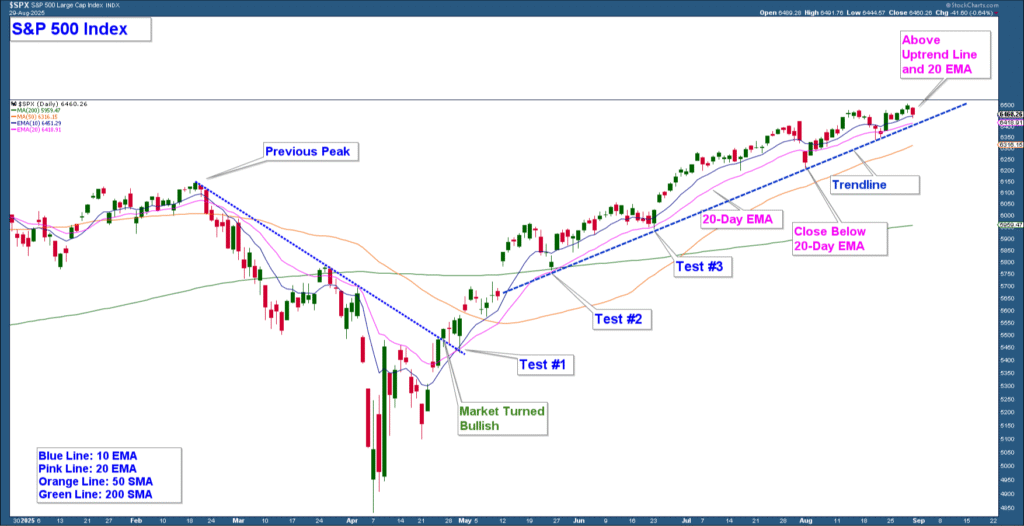 The bullish trend remains intact. Major indexes advanced again in August, with the S&P 500 holding firmly above its uptrend line and key moving averages. Even when the index briefly dipped below the 20-day moving average in early August, it quickly recovered, reinforcing that support level and keeping the short-term outlook bullish.