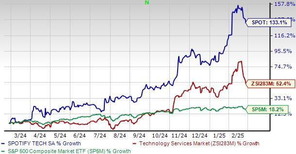 Spotify Technology S.A. SPOT shares have skyrocketed 133.1% in a year, outperforming the 52.4% rally of its industry and the 18.2% rise in the Zacks S&P 500 Composite.