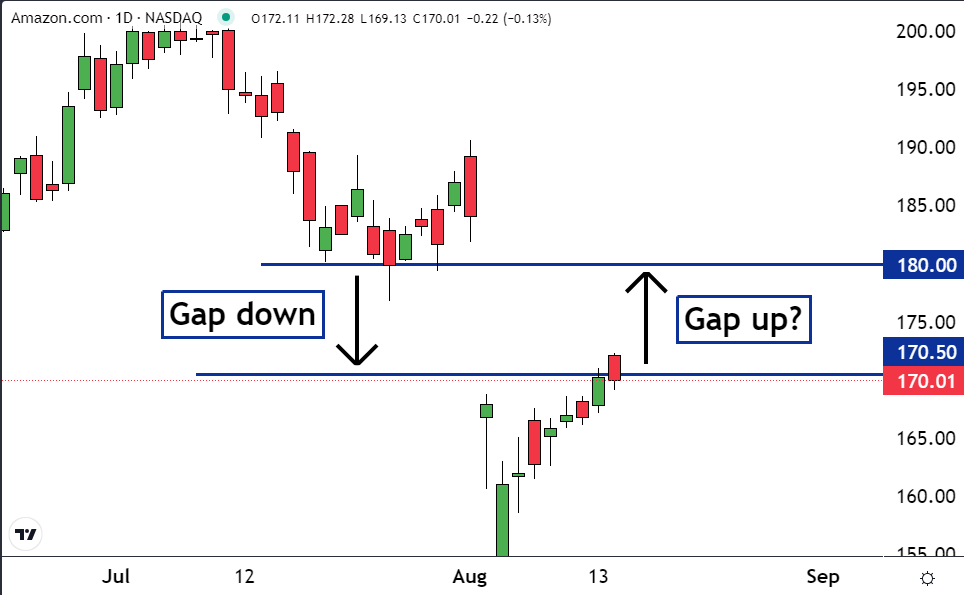 Amazon’s recent price movement between Aug. 1 and Aug. 2 exemplifies a scenario where the stock closed at $187.04 on the former date and opened at $166.75 on the latter, resulting in a noticeable price gap. With no trading occurring at these intermediate points, there is an absence of buyers beset by regretful sentiments.