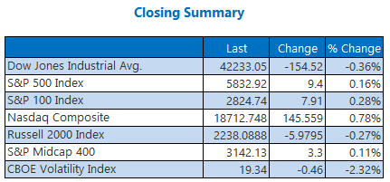 After struggling for direction most of the day, stocks finished mixed, with the Dow failing to claw its way back above breakeven. The S&P 500 eked out a comfortable gain, while the tech-heavy Nasdaq enjoyed a triple-digit pop, record high, and fourth-straight daily win as Big Tech geared up for earnings. Alphabet (GOOGL), Advanced Micro Devices (AMD), and Snap (SNAP) are among those slated to report after the close.