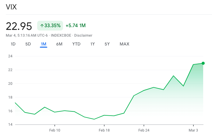 With tariffs on Canada, Mexico and China ramping up, volatility is officially back in business. The VIX has surged over 33% over the past month: