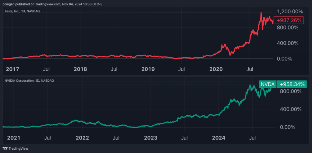 During Trump’s term from November 2016 to November 2020, Tesla stock surged by an astounding 987%, yielding an annualized return of roughly 84%.