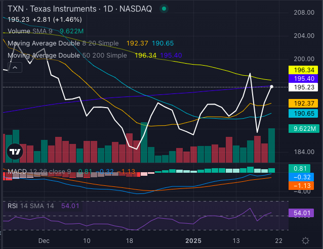 A Death Cross—where the 50-day moving average falls below the 200-day moving average—is often viewed as a bearish signal, hinting at potential downside. TXN stock, at $195.23, just shy of its 50-day SMA of $196.34 and its 200-day SMA of $195.40.