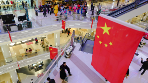 A large shopping mall in the central city is festooned with Chinese flags in celebration of the National Day after the victory against the Covid-19 epidemic.