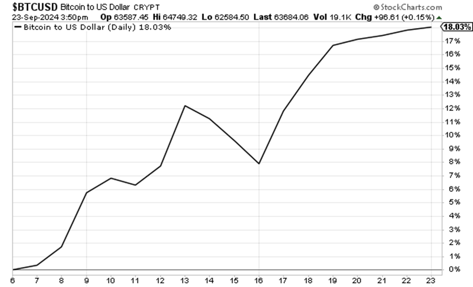 Chart showing that bitcoin has jumped 18% is now trading above $63,000 since September 7