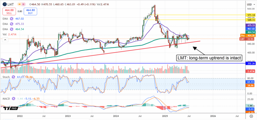 Lockheed Martin Corporation’s problems extend beyond tariffs and include weaknesses in the F-35 program and a lost contract in 2024. However, those issues are already priced into the stock, which is trading near critical support and a long-term uptrend line, as of mid-2025.