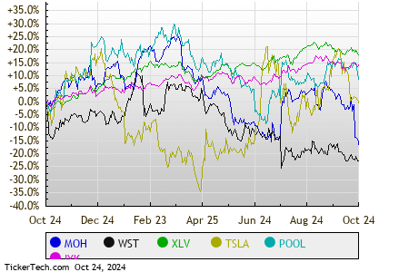 Looking at the sectors faring best as of midday Thursday, shares of Healthcare companies are outperforming other sectors, up 0.5%. Within that group, Molina Healthcare Inc (Symbol: MOH) and West Pharmaceutical Services, Inc. (Symbol: WST) are two large stocks leading the way, showing a gain of 19.6% and 17.3%, respectively. Among healthcare ETFs, one ETF following the sector is the Health Care Select Sector SPDR ETF (Symbol: XLV), which is down 0.4% on the day, and up 11.08% year-to-date. Molina Healthcare Inc, meanwhile, is down 9.00% year-to-date, and West Pharmaceutical Services, Inc., is down 4.41% year-to-date. Combined, MOH and WST make up approximately 0.8% of the underlying holdings of XLV.