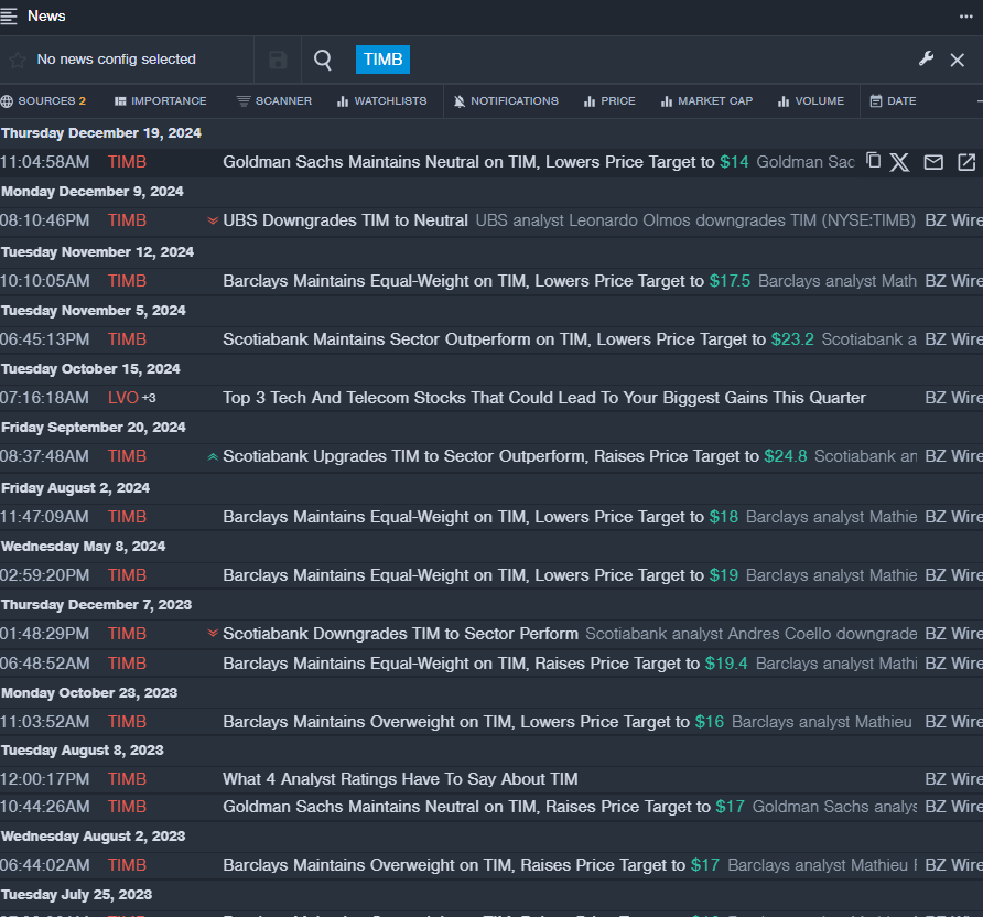 - On Dec. 19, Goldman Sachs analyst Vitor Tomita maintained TIM with a Neutral and lowered the price target from $16.2 to $14. The company’s stock fell around 14% over the past month and has a 52-week low of $11.76.