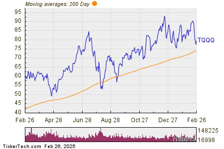 Looking at the chart above, TQQQ’s low point in its 52 week range is $48.80 per share, with $93.7892 as the 52 week high point — that compares with a last trade of $79.61. Comparing the most recent share price to the 200 day moving average can also be a useful technical analysis technique — learn more about the 200 day moving average ».