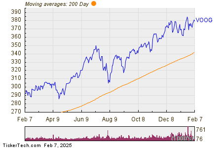 The chart below shows the one year price performance of VOOG, versus its 200 day moving average: