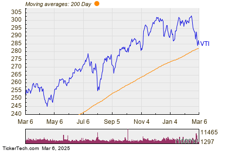 The chart below shows the one year price performance of VTI, versus its 200 day moving average: