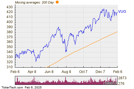The chart below shows the one year price performance of VUG, versus its 200 day moving average: