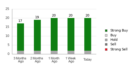 Alibaba currently has an average brokerage recommendation (ABR) of 1.20, on a scale of 1 to 5 (Strong Buy to Strong Sell), calculated based on the actual recommendations (Buy, Hold, Sell, etc.) made by 20 brokerage firms. An ABR of 1.20 approximates between Strong Buy and Buy.