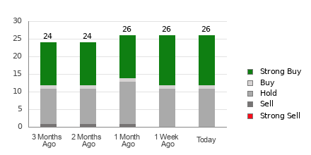 Chewy currently has an average brokerage recommendation (ABR) of 1.88, on a scale of 1 to 5 (Strong Buy to Strong Sell), calculated based on the actual recommendations (Buy, Hold, Sell, etc.) made by 26 brokerage firms. An ABR of 1.88 approximates between Strong Buy and Buy.