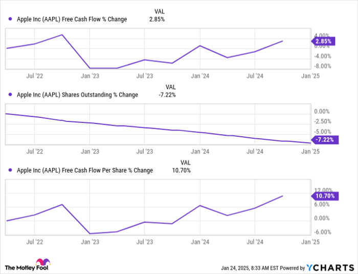Investors can think of free cash flow as earnings a company can use to pay dividends, reinvest, reduce debt, or repurchase stock. With $108.8 billion in free cash flow over the past 12 months, Apple can pull on a lot of different levers to keep earnings per share moving in the right direction over the long run.