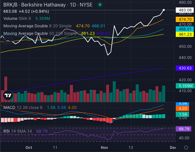 Berkshire Hathaway Inc‘s BRK stock soared to unprecedented levels, closing Wednesday at $483.08 after touching a 52-week high of $491.67.