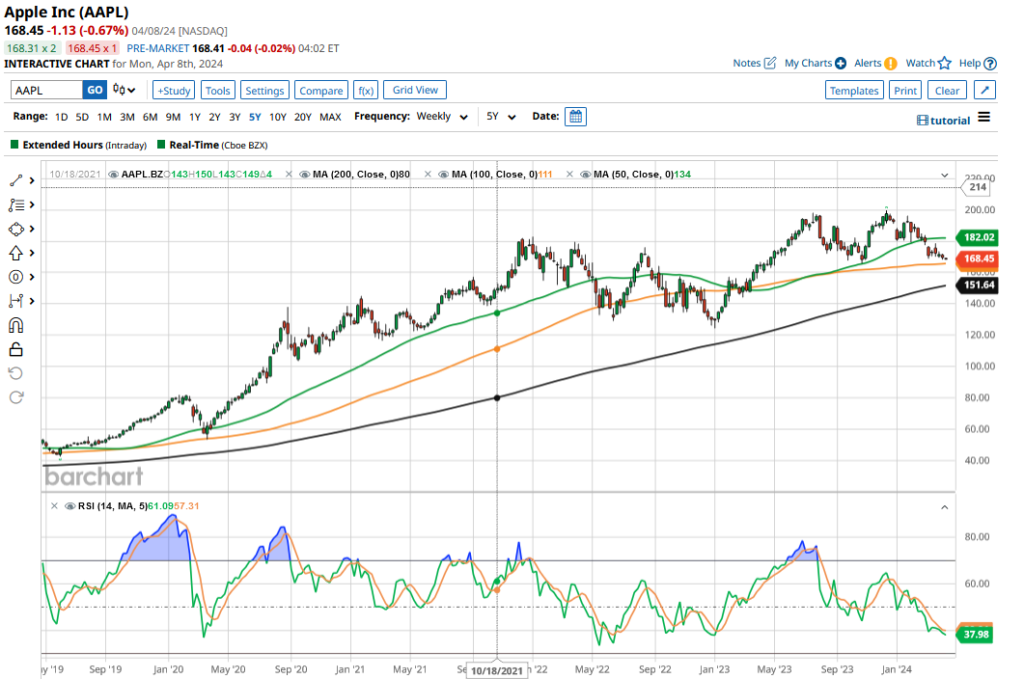 Apple (AAPL) – the tech giant once soaring to glory – finds itself in a perplexing nosedive. After a stellar performance in recent years, clinching the top spot among FAANG stocks repeatedly, Apple’s current trajectory tells a dismal tale. The charts paint a grim picture, with Apple’s stock price plunging to depths unseen since October, skirting perilously close to its 52-week lows. The millstone of decline seems tightly wound around Apple’s neck, leaving investors pondering – what goes up, must it always come down?