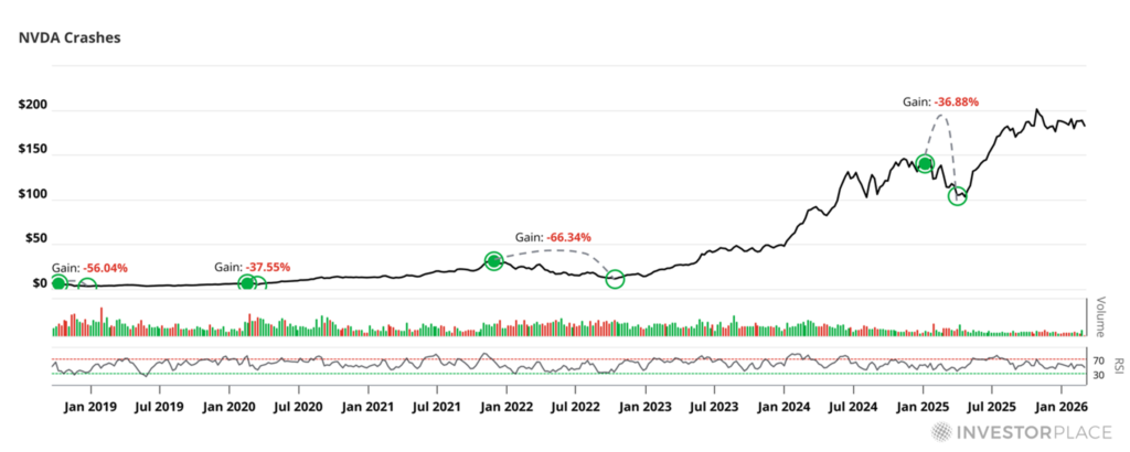 Nvidia alone has endured four major crashes in eight years. The stock ultimately advanced — but holding through those drops required unusual discipline.