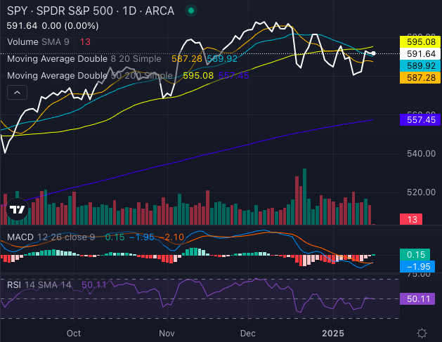 - Longer-term caution: SPY is trading below its 50-day moving average of $595.08, hinting at potential weakness.