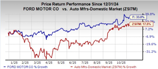 Shares of Ford have gained 33% year to date, outperforming the industry. General Motors has risen 29%, while Stellantis has lost roughly 23% over the same period.